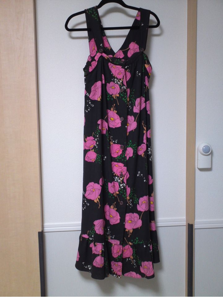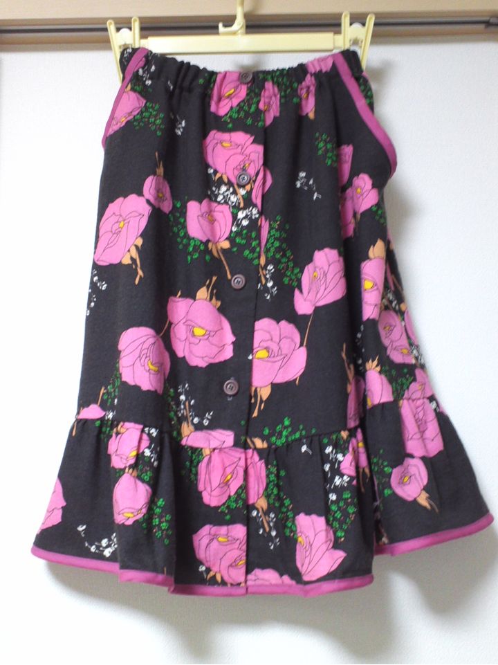 ↑ポケットを付けて、バイアスでふちを装飾。ボタンも足しました。丈は膝下です。