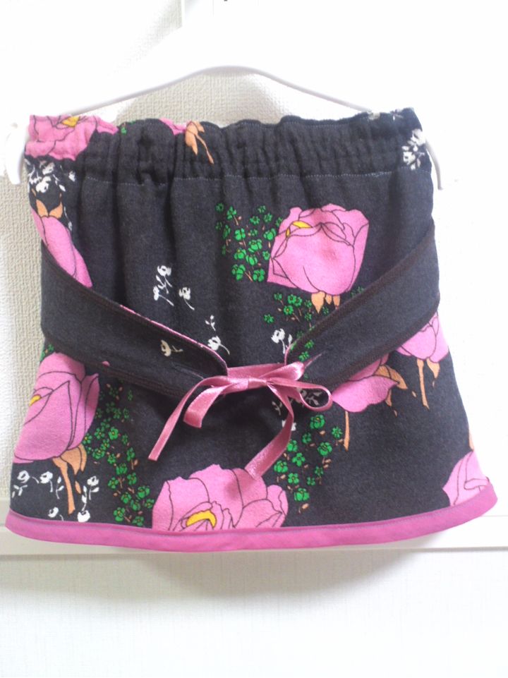 ↑生地がだいぶ余ったので、娘の分。ショルダー部分を利用してベルトを付けてみました。